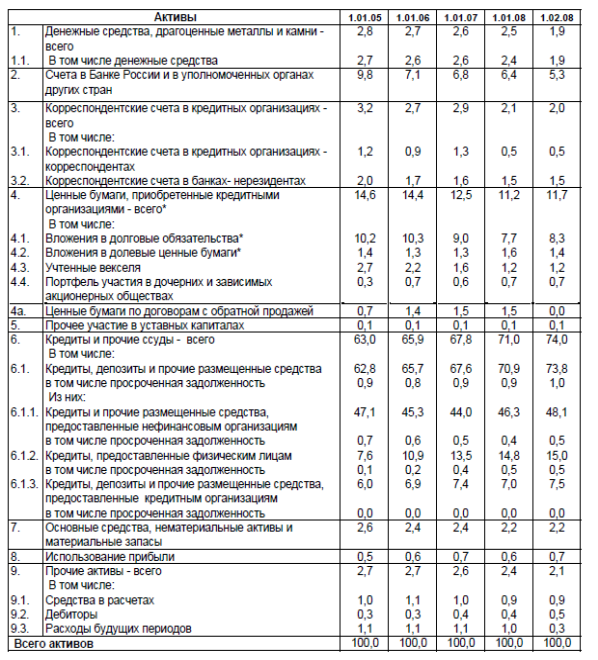 Таблица 4.3 Структура активов кредитных организаций, сгруппированных по направлениям вложений (в % к активам) (март 2008 год)
