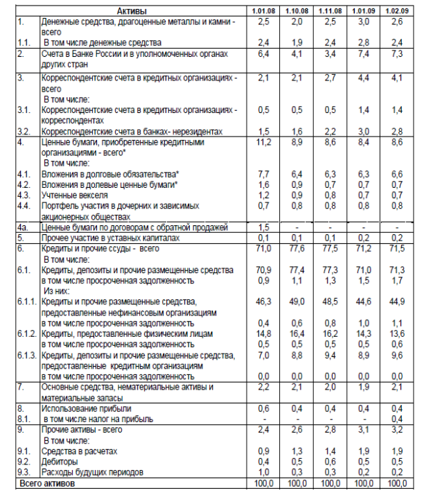 Таблица 4.4 Структура активов кредитных организаций, сгруппированных по направлениям вложений (в % к активам) (март 2009 г.)