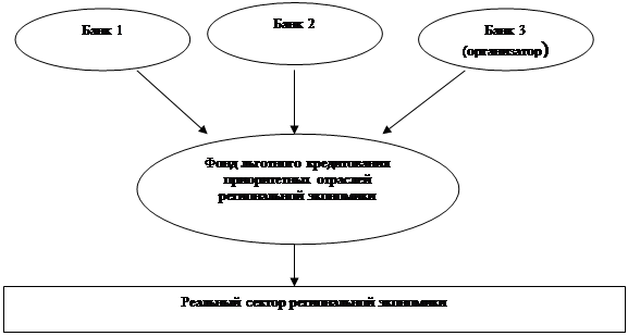 Например, региональные органы власти определили на ближайшие пять лет четыре приоритетных отрасли, которые нуждаются в значительных капитальных вложениях. Один банк с такими объемами не справиться. К тому же слишком рискованно для него вкладывать существенную сумму в одну отрасль, к тому же существует норматив, который не дает такой возможности (не более 20% от капитала). Эта проблема решается с помощью синдицированного кредитования, которое предполагает объединение капиталов. Предлагаемый вариант решения данной проблемы схематично представлен на рисунке 3.2.