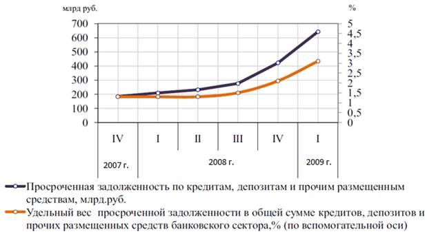 По данным Центрального банка РФ, просроченная задолженность по кредитам, депозитам и прочим размещенным средствам выросла более чем в два раза, и увеличилась по состоянию на 1 июля 2009 г. на 97 % по сравнению с данными 2008 года. Это наглядно отражает рисунок 2.1. Причем стремительный рост объемов просроченной задолженности демонстрирует 4 квартал 2008 года. Удельный вес ее в этот период возрос с 1,5% в начале периода до 3% в конце, и составила 700 млрд. руб. Такая ситуация возникла по причине возникновения мирового финансового кризиса, который прежде всего оказал негативное влияние на банковский сектор. Дело в том, что из-за паники на фоне мирового финансового кризиса, в стране стал наблюдаться дефицит денежной массы, в частности наличности. Предприятия и организации стали на себе ощущать нехватку денег на покрытие текущих расходов. В период с декабря 2008 – по март 2009 года прекратилось финансирование крупных инвестиционных проектов, многие из них были законсервированы на неопределенный срок, предприятия и организации стали пересматривать свои стратегические планы, оказываться от реализации различных программ. К тому же образовалась просрочка по текущим обязательствам (перед персоналом, банками, поставщиками).