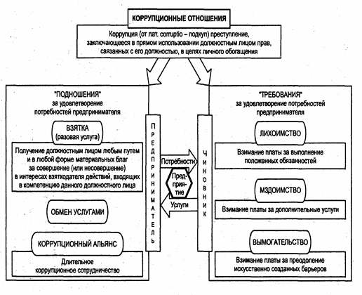 Например, для того чтобы открыть свое дело, начинающему предпринимателю необходимо посетить от 20 до 30 всевозможных инстанций и получить от 50 до 90 согласований, без чего регистрация невозможна. И если бы просто стоять в очереди - надо еще и положить "на лапу". Об этом знают все, кому приходится заниматься вопросами реальной экономики. Коррупционные отношения в предпринимательстве представлены в структурном изложении на рис. 1.