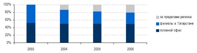 С открытием в 2003 – 2004 гг. филиалов в Москве, Воронеже и Уфе Банк расширил географию своей деятельности. Примечательно, что при значительном росте кредитного портфеля, соотношение между головным офисом и филиалами по объему кредитного портфеля остается практически неизменным (50/50), то есть головной офис и филиалы показывают сопоставимые темпы рост. Доля кредитов за пределами Татарстана относительно невелика, около 20%, но уверенно растет (рис.2.2.1). На начало 2006г. остатки задолженности по кредитам за пределами Татарстана составили около 900 млн. руб. (31,3 млн. долл. США).