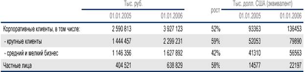Наибольший рост выдачи кредитов произошел по крупным клиентам - по сравнению с 2004г. увеличение почти в 2 раза. В течение 2005г. Управлением по обслуживанию корпоративных клиентов было выдано кредитов на общую сумму 12,7 млрд. руб. (441 млн. долл. США). Объем кредитного портфеля на 01.01.2006 г. по Управлению составляет около 2,4 млрд. руб. (83.4 млн. долл. США) В связи с открытием филиала в г. Уфа расширилась география оказываемых банком услуг в других регионах России.