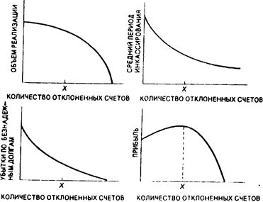 Чтобы максимизировать прибыль, получаемую в результате проведения кредитной и инкассационной политики, фирма должна одновременно изменять свою стратегию в той и другой сфере, пока не достигнет оптимальною решения. Это решение определит наилучшую комбинацию нормативов кредитоспособности, сроков кредита, стратегии скидок, особых условий и уровня расходов по инкассации. Для большей части переменных по мере того, как политика изменяется от отсутствия воздействия до чрезмерного влияния, прибыль замедляющимися темпами увеличивается до некоторой точки, а затем падает. Рис.3 показывает эту зависимость для качества отклоненных счетов. При отсутствии нормативов кредитоспособности, когда все заявки на кредит удовлетворяются, реализация становится максимальной, но это нивелируется большими потерями по безнадежным долгам, а также альтернативными издержками ни содержанию довольно большого объема дебиторской задолженности. Последнее вызвано увеличением среднего срока инкассации. Когда установлены нормативы кредитоспособности и отклоняются заявки на кредит, доход от реализации падает, но при этом снижаются также средний период инкассации и потери по безнадежным долгам. Из-за тою, что последние первоначально снижаются быстрее, чем объем продаж, прибыль увеличивается.