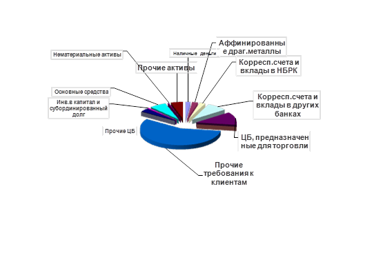 Также из данной таблицы видно, что анализируя структуру активов АО «Валют – Транзит Банка» за 31 декабря 2003 года наибольший удельный вес составляют также такие активы банка, как прочие требования к клиентам (за вычетом резервов на возможные потери) – 59,9%; ценные бумаги, предназначенные для торговли (за вычетом резервов на возможные потери) – 13,6%; корреспондентские счета и вклады в других банках (за вычетом резервов на возможные потери) – 8,95% и прочие активы и наименьший удельный вес также составляют такие активы банка, как инвестиции в капитал и субординированный долг – 0,17%; нематериальные активы (за вычетом амортизации) – 0,49%; наличные деньги – 1,32% и так далее. Следуя данной таблице также можно построить диаграмму активов банка за 31 декабря 2003 года.