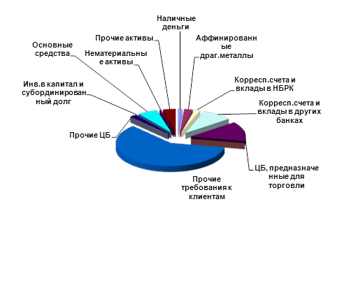 Из таблицы 8 видно, что анализируя структуру активов банка на 30 сентября 2004 года наибольший удельный вес составляют такие активы банка, как прочие требования к клиентам (за вычетом резервов на возможные потери) – 56,89%; ценные бумаги, предназначенные для торговли (за вычетом резервов на возможные потери) - 12,44%; корреспондентские счета и вклады в других банках (за вычетом резервов на возможные потери) – 8,2% и другие прочие активы; а наименьший удельный вес составляют такие активы банка, как нематериальные активы (за вычетом амортизации) – 0,46%; инвестиции в капитал и субординированный долг – 0,6%; наличные деньги – 1,96% и так далее. Следуя данной таблице можно построить диаграмму активов банка на 30 сентября 2004 года.