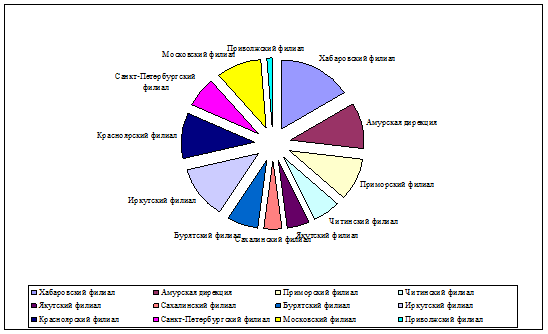 Наибольшая часть банковских вложений в 2009 году приходилась на кредитование. По филиалам кредитный портфель распределился следующим образом: Амурская дирекция - 11 %, Хабаровский филиал – 16 %, Приморский филиал - 10 %, Читинский филиал– 6 %, Якутский филиал - 5%, Сахалинский филиал - 4%, Бурятский филиал - 7%, Иркутский филиал - 12%, Красноярский филиал - 11%, Санкт-Петербургский филиал - 7%, Московский филиал – 10%, Приволжский филиал - менее 1%.