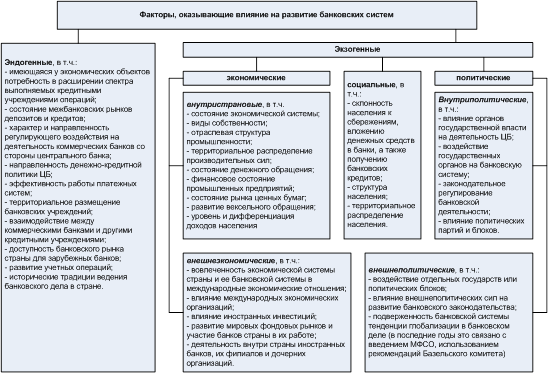 Т.е. мы видим, что на ход развития банковской системы, а, следовательно, и кредитной системы влияют экономические, политические и социальные факторы. На рис.2 представлены факторы, оказывающие влияние на развитие современных банковских систем. При этом ряд факторов являются экзогенными (или внешними) по отношению к ним, а ряд других эндогенными факторами, действующих в самих банковских системах (см. рис.2).