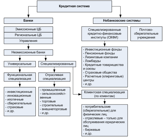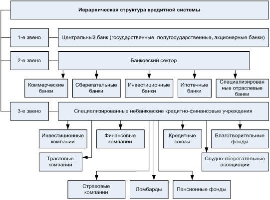Структуру институциональной кредитной системы образуют два основных звена кредитной системы: банковские и парабанковские учреждения. Первое из них представлено банками и другими учреждениями банковского типа, второе - небанковскими организациями. Структуру кредитной системы можно изобразить в виде схемы (см. рис.3).