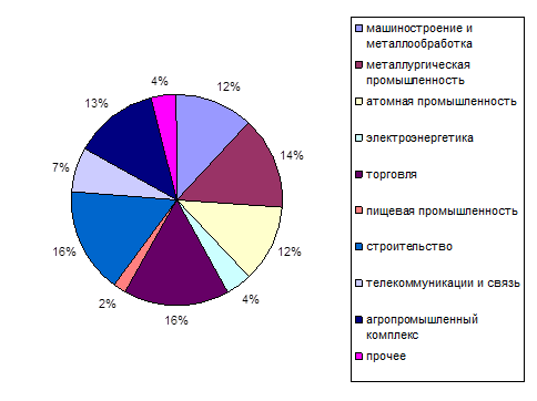 Приоритетным направлением для Банка в сфере кредитования является предоставление кредитов в реальном секторе экономики, предприятий агропромышленного комплекса, транспорта, энергетики, металлургии и машиностроения. Банк отдает предпочтение кредитам во всех отраслях экономики со сроком реализации до трех лет при наличии достаточного обеспечения. Налажена работа с ценными бумагами и выпуск пластиковых карт. В настоящий момент в Банке кредитуется более 200 предприятий, в том числе 7 банков Ростовской области (межбанковские кредиты). Отрасли промышленности, в которых кредитует Банк, отображены на диаграмме: