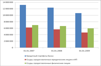 Из таблицы видно, что кредитный портфель отделения почти в равных долях состоит из ссудной задолженности юридических и физических лиц, с небольшим перевесом в сторону задолженности физических лиц. В течение анализируемого периода 2007-2008 г.г. произошло существенное уменьшение кредитного портфеля по ссудам, предоставленным как юридическим лицам, так и физическим лицам. Динамика изменения кредитного портфеля представлена на рисунке 1.