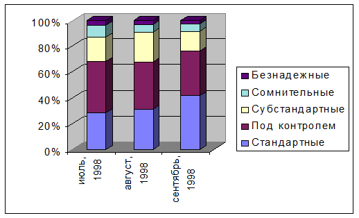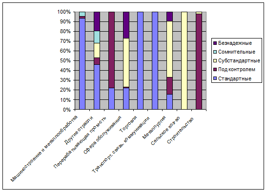 Необходимо отметить, что количество безнадежных и сомнительных кредитов значительно отличается по отраслям, так, например, по состоянию на сентябрь 1998 года, в кредитном портфеле рассматриваемого филиала Банка большую часть безнадежных долгов составляла кредиты, предоставленные металлургическим предприятиям и сфере обслуживания: