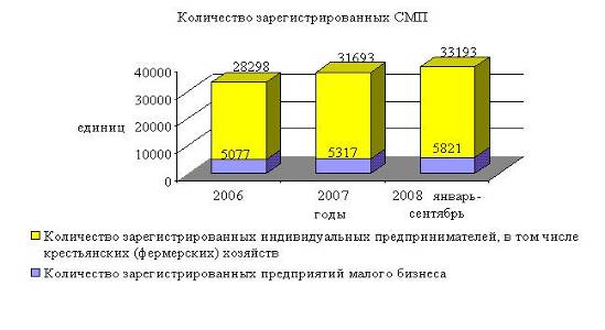 С целью создания благоприятного климата для развития малого бизнеса были разработаны программа поддержки и развития малого предпринимательства на 2003 - 2005 годы и программа развития малого предпринимательства на 2006-2008 годы. Развитие малого предпринимательства - это наименее затратный для государства способ создания новых рабочих мест, стимулирующий насыщение рынка товарами и услугами, стабильная база налоговых поступлений. Опыт государственной поддержки малого предпринимательства на территории области в течение 2006 - 2008 годов подтверждает это. За 2006 год в области было зарегистрировано 33375 субъектов малого предпринимательства (далее - СМП), из них 28298 индивидуальных предпринимателей, в том числе крестьянских хозяйств, и 5077 предприятий, имеющих статус юридического лица. В 2007 году количество СМП составило 37010 единиц, темп роста к 2006 году составляет 110,9%. На 1 октября текущего года в области зарегистрировано 39014 СМП, из них 33193 осуществляют свою деятельность в форме индивидуального предпринимательства, 5821 - в форме юридического лица. Количество действующих субъектов малого бизнеса за годы действия этих программ выросло более чем в 3,5 раза, причем основной рост произошел за счет увеличения количества индивидуальных предпринимателей. Если в 2000 году соотношение юридические лица - индивидуальные предприниматели было 45 на 55, то к концу 2008 года это соотношение изменилось на 35 на 65. Это говорит о качественном росте частного сектора в городе. По состоянию на начало 2009 года, наибольшее число предприятий малого бизнеса сосредоточено в сфере торговли (48,5%) и в операциях с недвижимым имуществом, аренде и предоставлении услуг потребителям (22,2%). По показателю «плотности» малых предприятий (4000 МП на 100 тыс. жителей) Алматы находится на уровне среднеевропейских городов (4 - 6 тыс. малых предприятий на 100 тысяч жителей).