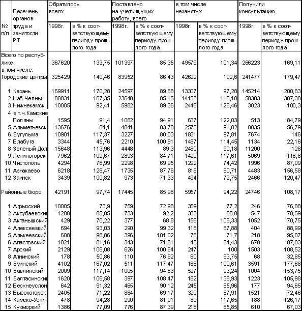 Обращаемость граждан в органы труда и занятости Республики Татарстан за январь-ноябрь 1998 года представлена в таблице 1.