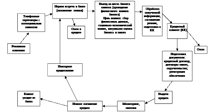 В отличие от микрокредита, где рассчитываются свободные денежные средства на конец месяца независимо от использования кредита, малые кредиты могут значительно изменить состояние предприятия. Поэтому анализ кредитов в рамках Программы кредитования малого бизнеса должен эти изменения выявить. Возможности или риски проекта зависят от разных факторов, которые должен проанализировать кредитный инспектор. Основные пункты анализа (рынок, процесс производства, управление, финансовые данные) имеют одинаковое значение, недостатки в одном из этих аспектов, могут быть компенсированы преимуществами в других (если эти недостатки не настолько серьезны, что могут повлиять на успех проекта в целом). Кредитный цикл рассмотрения заявки по Программе кредитования малого бизнеса представлен ниже (Рисунок 7).
