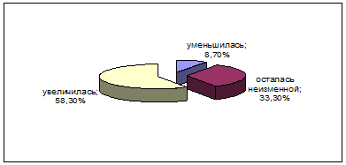 Об эффективности работы с малым предпринимательством, правильности выбранной стратегии можно судить, опираясь на накопленный кредитными организациями опыт. Тот факт, что лишь у 8,70% исследованных банков доля кредитования малого бизнеса за год работы уменьшилась, у 33,30% – осталась неизменной, а у 58,30% увеличилась, свидетельствует в целом о перспективности работы банков в этом секторе экономики и экономической оправданности расширения своего присутствия на рынке финансовых услуг для малого предпринимательства (Рисунок 10).