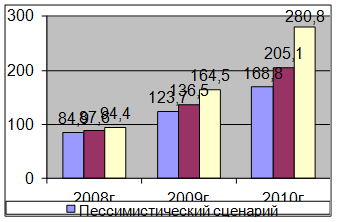 Пессимистичный вариант предполагает, что государство примет пассивную стратегию поддержки сегмента, фактически сохранив status quo в области стимулирования малых предприятий. В этом случае ограничения, связанные с развитием рынка, будут сниматься по мере его естественного «созревания». Банки найдут способ решить проблему с залогами, наработают опыт, конкуренция будет стимулировать снижение процентных ставок, а сами малые предприятия перестанут относиться к кредитованию как к финансовой экзотике. Согласно этому сценарию темпы роста портфелей будут постепенно замедляться. В этом случае к 2010 г. накопленный объем кредитов МСБ составит, по нашим прогнозам, порядка 168 млрд долл.