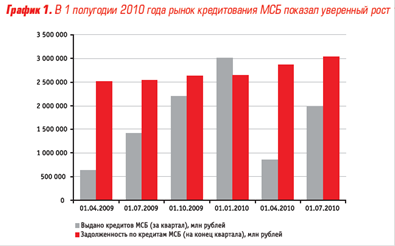 Кредитование банками малого и среднего бизнеса (МСБ), демонстрировавшее уверенный рост даже в кризисный 2009 год, в 1 полугодии 2010 года существенно ускорилось. По итогам шести месяцев текущего года объем предоставленных МСБ кредитов достиг 2 трлн. рублей, на 40% превысив результаты аналогичного периода 2009 года (см. рис. 1).