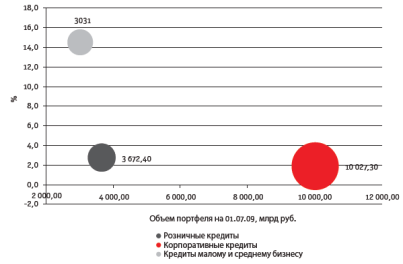 Темп прироста рынка кредитования МСБ в 1 полугодии 2009 года был схожим (36%), однако со знаком «минус». По результатам 1 полугодия можно с уверенностью говорить, что рынок кредитования МСБ постепенно оживляется, увеличивается спрос на кредитные продукты. Период стагнации, характерный для прошлого года, завершился. Начиная с февраля 2010 года негативный тренд в кредитовании был сломлен. Стремительный рост кредитования привел и к заметному увеличению кредитного портфеля МСБ – на 1.07.2010 он составил 3 млрд. рублей, что на 14,5% больше начала 2010 года. По темпам роста портфеля (см. рис. 2) кредитование МСБ в России продолжает со значительным отрывом опережать ближайших «конкурентов» – корпоративный сегмент (1,9%) и розничное кредитование (2,8%). В результате доля МСБ в условиях кризиса в портфеле кредитов ЮЛ и ИП устойчиво растет: 23% на 1.07.2010 против 21% на 1.01.2009. Кредитование МСБ остается крайне привлекательным сегментом для российских банков. 51 из 74 опрошенных «Экспертом РА» банков видят данное направление бизнеса одним из приоритетных с точки зрения соотношения рисков и доходности. При этом 24 банка в 1 полугодии 2010 года запустили новые специализированные программы по кредитованию МСБ (включая начало сотрудничества с Российским банком развития). Важно отметить, что за исключением одного банка все опрошенные участники рынка готовы кредитовать субъекты МСБ самостоятельно, без государственных гарантий по кредитам.