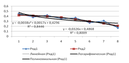 Полученные уравнение показывает, что наблюдается тенденция снижения риска: с 2003г. по 2010г. величина риска в среднем снижалась на 2*0,001=0,002 пункта в год.