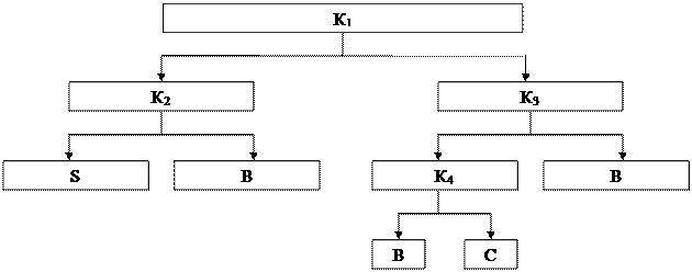При классификации кредитов возможно использование модели CART (Classification and regression trees), что переводится как «классификационные и регрессионные деревья». Это непараметрическая модель, основные достоинства которой заключаются в возможности широкого применения, доступности для понимания и легкости вычислений, хотя при построении применяются сложные статистические методы. В «классификационном дереве» фирмы-заемщики расположены на определенной «ветви» в зависимости от значений выбранных финансовых коэффициентов; далее идет «разветвление» каждой из них в зависимости от следующих коэффициентов. Точность классификации при использовании данной модели – около 90%. Пример «классификационного дерева» представлен на рис. 1.2, где Кi — финансовый коэффициент; Рi — нормативное значение показателя; В — предполагаемый банкрот; S — предположительно устойчивое состояние.