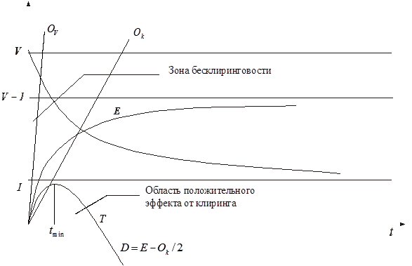 Область возможного положительного эффекта от клиринга задается отрезком времени от 0 до Т. Т есть корень уравнения