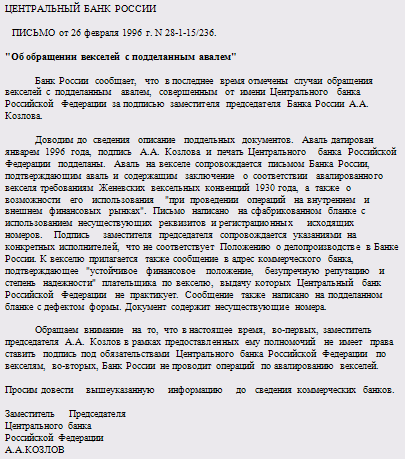 Однако я надеюсь, что в дальнейшем вексельное обращение в России примет более цивилизованные формы, когда досконально будут исполняться законы и не будут эмитировать векселя вместо обычных товарных обязательств, предприятия-должники будут самостоятельно выпускать векселя, получать под них вексельное поручительство банка и расплачиваться авалированным векселем со своими кредиторами. При этом банки, с целью минимизации своих рисков, сопровождающих гарантийные операции, могут практиковать авалирование векселей под залог конкретного имущества или прав векселедателей. Будут решены проблемы гражданского права процедуры "ареста" векселя, солидарной ответственности и другие.