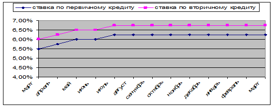 Снижение базовых ставок производится ФРС в периоды уменьшения деловой активности и служит сигналом для общего понижения процентных ставок в стране. Это приводит к удешевлению банковского кредита, также к облегчению условий кредитования через рынок долговых ценных бумаг. Сравнительная дешевизна и доступность кредита ведёт к определённому повышению деловой активности и помогает преодолеть экономические кризисы, стимулирует рост инвестиций в акции, благодаря чему повышается экономическая активность. Когда силы циклического подъёма действуют чрезмерно активно и наблюдается повышение темпов инфляции, ФРС прибегает к повышению базовых ставок, подавая сигнал о необходимости удорожания кредита. Рост ставок процента ограничивает кредит и ведёт к сдерживанию деловой активности. Динамика процентных ставок за последний год (см. Рис. 1.) показывает, что ФРС США первые полгода 2006 г. проводила ограничительную денежно-кредитную политику, а со второго полугодия перешла к поддержанию достигнутого уровня экономической активности.