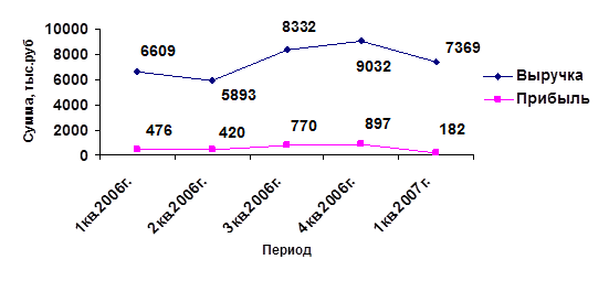 По итогам 2006 года и за первый квартал 2007 года предприятием получена прибыль. На первый взгляд, наблюдается снижение прибыли. Среднеквартальное значение прибыли за 2006 год составляет 709 тыс. руб., а за первый квартал 2007 года – 180 тыс. руб., что на 529 тыс. руб. меньше среднеквартального. Это может выступать как неблагоприятный фактор.