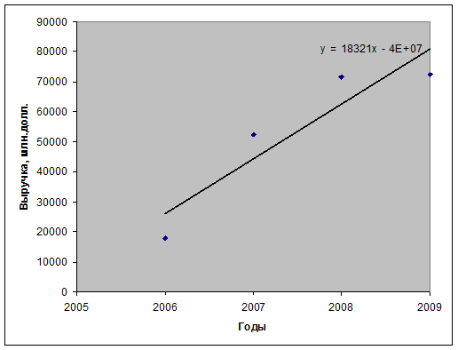 На основании полученного уравнения у=18321х-4Е+07 спрогнозируем выручку на 2010-2014гг.: