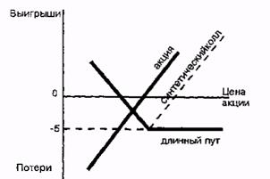 Как следует из условий сделки, хеджируя свою позицию, инвестор несет затраты в размере 5 долл. с акции. Хеджер застраховал себя от падения цены акций ниже 100 долл., поскольку опцион дает ему право продать их за 100 долл. Одновременно такая стратегия сохраняет инвестору выигрыш от возможного прироста курсовой стоимости бумаг. Как видно из рисунка, использованная стратегия представляет собой синтетический длинный колл.