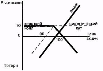 Как следует из графика, такое хеджирование позволяет ему застраховаться от повышения курса акций только на величину полученной от продажи опциона колл премии (10 долл.). Данная стратегия представляет собой не что иное, как синтетический короткий пут.