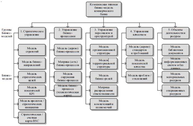 Бизнес-модель банка включает 4 группы бизнес-моделей в соответствии с основными системами управления: стратегическое управление, управление бизнес-процессами, управление персоналом и оргструктурой, управление качеством. В каждой группе находятся бизнес-модели по конкретным аспектам, соответствующим группе – системе управления (см. Рис. 1.1). 5-я группа «Объекты деятельности и ресурсы» является составной из различных вспомогательных бизнес-моделей.