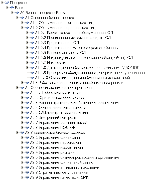 · Вертикальное описание бизнес-процессов или просто выделение всех бизнес-процессов банка в виде иерархического списка (дерева).