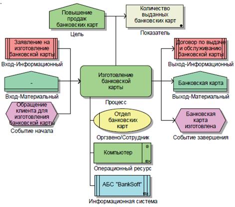 Модель окружения бизнес-процесса. Модель окружения бизнес-процесса создается перед его детальным описанием, для того чтобы показать границы процесса (входы-выходы, события начала-завершения) и атрибуты процесса (автоматизирующие его информационные системы, показатели, владелец, исполнители и многое другое). Пример модели окружения бизнес-процесса «Изготовление банковской карты» показан на Рис.1.5. [2]