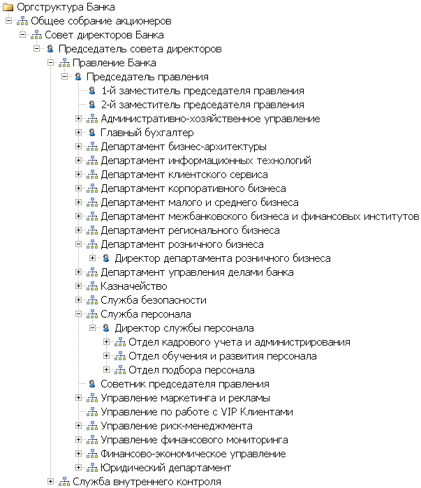 Модель организационной структуры. Одна из важнейших бизнес-моделей. Организационная структура наиболее легко поддается моделированию, так как она в большинстве случаев четко определена в банке в виде штатного расписания и нормативных документов службы персонала.