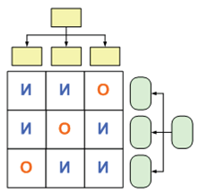 Матрица распределения ответственности. Данная бизнес-модель (см. Рис. 1.7) представляет собой таблицу, где по строкам указаны бизнес-процессы, по столбцам структурные звенья, а на пересечении строк и столбцов стоят условные обозначения: О – ответственный (владелец), И – исполнитель. Могут быть и другие обозначения.