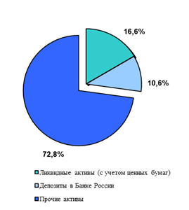Объем ликвидных активов и вложений в ликвидные ценные бумаги составил на 01.01.2010г. 190397 тыс. руб., это 16,6% от суммарных активов банка (диаграмма 1). В совокупности со средствами, размещенными в депозиты Банка России, высоколиквидные активы составляют 27,2% от валюты баланса. На 01.01.2009г. доля высоколиквидных активов составляла 15,3%.