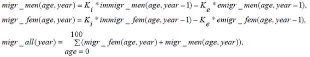 migr_all(age, year) — миграция мужчин и женщин по годам; K — коэффициент миграции относительно предыдущего года.