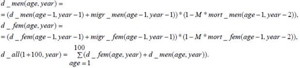 где d_men(age –1, year –1) –количество мужчин возраста age –1 в предыдущем году; d_fem(age –1, year –1) –количество женщин возраста age –1 в предыдущем году; M–коэффициент изменения смертности [0<1>] по сравнению с предыдущим годом.