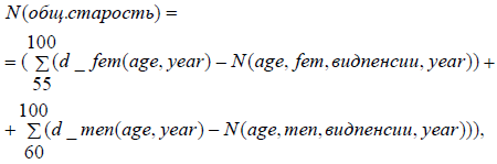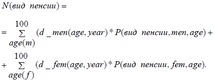 где d_men(age, year) – количество мужчин данного возраста в данный год по демографическому распределению (или женщин); P(вид пенсии, men, age) – вероятность наличия пенсионеров данной категории, данного пола, данного возраста).