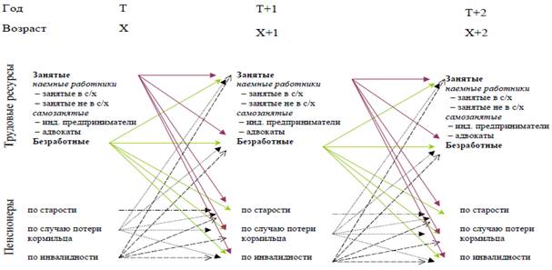 2) данные о распределении численности наемных работников по уровню заработной платы, используемые для определения объемов поступлений в пенсионную систему с фонда оплаты труда наемных работников. В расчетах предусмотрено дифференцированное распределение по уровню заработной платы отдельно для наемных работников, занятых в сельскохозяйственном производстве и для остальных наемных работников. В модели используется допущение о том, что наемный работник в течение всей трудовой деятельности может переходить из одной доходной группы в другую;