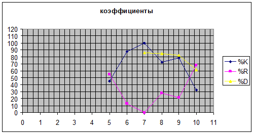 В 5 день критерий находится в зоне перепроданности подготовится к покупке, в 6,7 находится в зоне перекупленности подготовится к продаже на 8,9 день выходит из зоны перекупленности покупке; 10 день показывает что надо покупать.