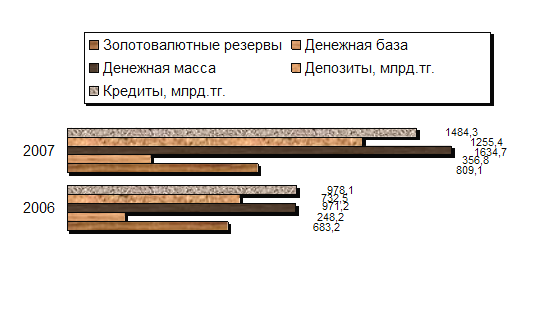 Данная диаграмма показывает динамику основных макроэкономических показателей Национального банка РК за периоды от 2006 по 2007 года включительно. Здесь виден рост экономических показателей в 2007 году по сравнению с 2006 годом, а именно: