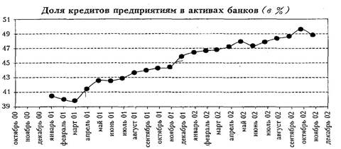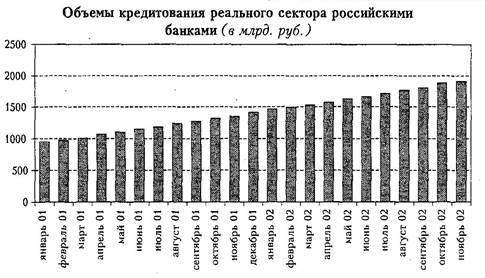 Если на первом этапе активы российских банков росли прежде всего за счет увеличения ликвидности как рублевой, так и валютной, то есть обслуживания оттока капитала, то в настоящее время источники их роста качественно изменились. Теперь в его основе лежит кредитование реального сектора экономики, доля которого в ВВП повысилась в полтора раза - с 9-10% в 1996-1997 гг. до примерно 15% в 2002 г. (при этом доля кредитов в банковских активах возросла до 40%.