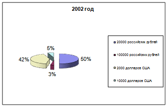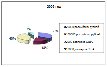 Анализируя нижеприведенные графики можно сказать, что крупные финансовые вложения (от 100000 российских рублей и от 10000 долларов США) во вклады «Универсальный» в 2003 году увеличились по сравнению с 2002 годом. И это характеризуется положительно, то есть экономика г.Биробиджана, а следовательно и количество состоятельных клиентов, улучшается и растет.