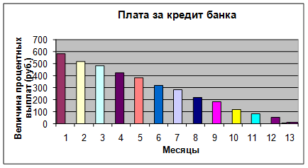 Плата за кредит (проценты) составит 3686,3 рублей. Цена кредита зависит от величины задолженности и составит в первые месяцы чуть более 500 рублей, а в последующие будет снижаться до 50 рублей в месяц (рис. 2.11).