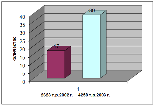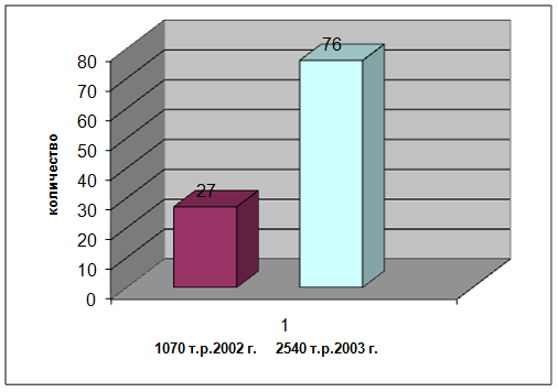 Анализируя диаграмму на рис. 2.13. можно сказать, что в 2003 году предоставлено под залог иностранной валюты на 22 кредита больше, по сравнению с 2002 годом. А если смотреть по сумме выданных кредитов, то она на 62% превышает сумму 2002 года.