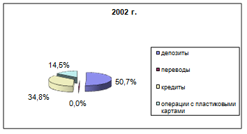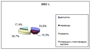 Если рассматривать рост прибыли за 2002-2003 г. за счет введения новых услуг, то можно сказать что в 2003 г. получено на 21,5% прибыли больше, чем за 2002 год. Если анализировать каждое направление работы банка с физическими лицами, то можно сказать, что основной доход банк получает от принимаемых депозитов и от выдаваемых кредитов (рис. 2.3.).