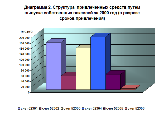 Говоря об объемах, проанализируем данные за 2000 год и январь 2001 года. Так, например, за указанный период всего было привлечено путем выпуска собственных векселей средств на общую сумму 627114 тыс. руб. из них в разрезе сроков привлечения (см. Диаграмму 2.):